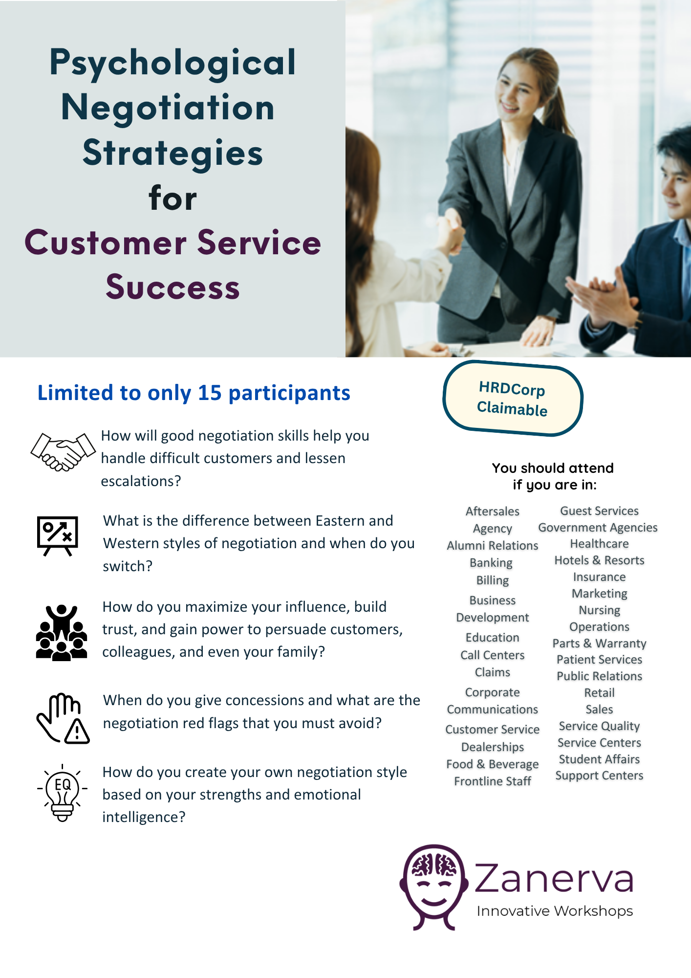 This workshop will teach you how to handle difficult customers and people in your life, reduce escalations, and create your own style of negotiation and persuasion.